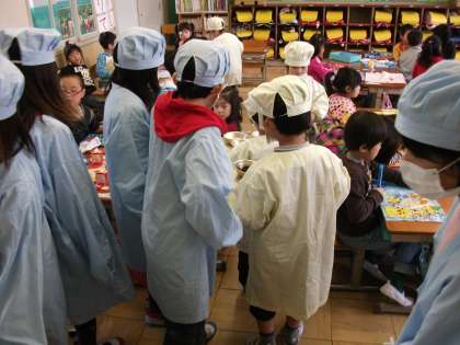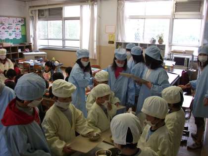 優しいお兄さんお姉さんが見本となり,1年生に配膳の仕方を教えています。「前のときよりも上手に配膳できているところがいいと思いました。」と1年生のいいところも見つけています。
