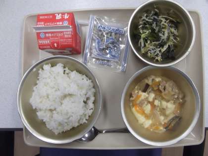 今日の給食の献立は,「麦ごはん」「ごもく豆腐」「ほうれんそうともやしのいためナムル」「じゃこ」「牛乳」です。