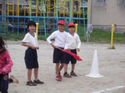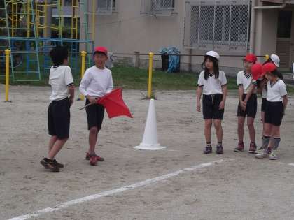 体育の時間に50m走のタイムを計っていました。みんな一生懸命に走っていました。