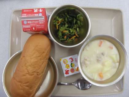今日の給食の献立は,「ミルクコッペパン」「じゃがいものクリームシチュー」「こまつなのソティ—」「かたチーズ」「牛乳」です。