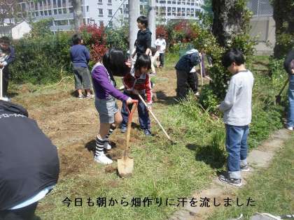 昨日雨でできなかった畑作りを1〜2時間めにクラスごとにがんばりました。自分たちの野菜を育てるんだ!という意識が強くなってきて,みんな一生懸命耕してくれています。