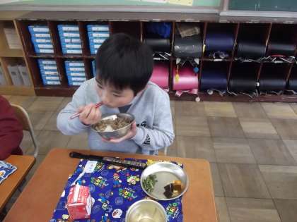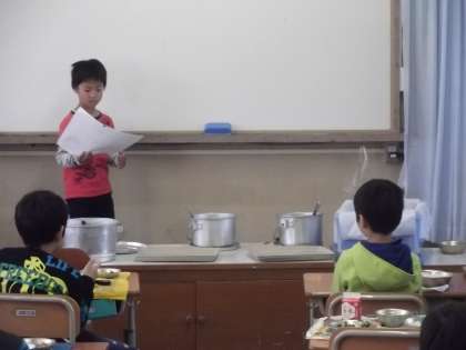給食時間にお邪魔しました。今日も給食準備がスムーズに終わりました。いただきます。給食はもちろん完食です。