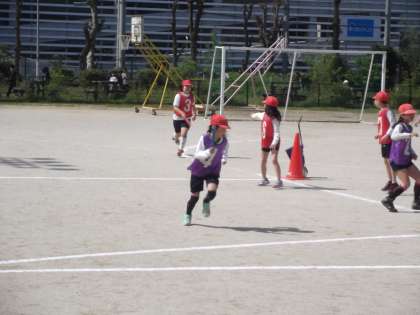 体育の時間に「リレー」の学習をしています。今日は,バトンの受け渡しの練習をしていました。
