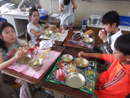 5年生の給食の様子です。放課後の遊びなどの話で盛り上がっていました。とても楽しそうな給食の時間でした。