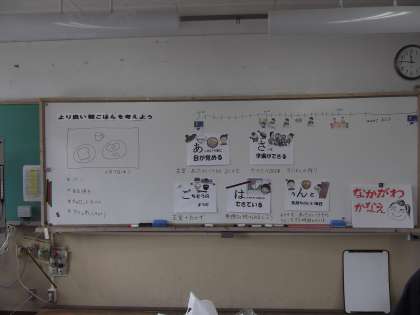 今年度,初めての食育が行われました。今日の食育の時間は,「よい朝ごはんを考えよう」ということでみんなで考えていました。どんな朝ご飯のメニューが出来たかなぁ?