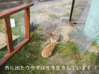 連休中も生き物の世話は必要です。毎日うさぎ小屋の掃除とエサやりは欠かせません。今日は,ウサギたちを外に出してやりました。うれしいのか?ひざにまとわりついて元気に外に飛び出していきました。約1時間ほどでしたが,草を食べたり,穴を掘ったりと動き回っていました。