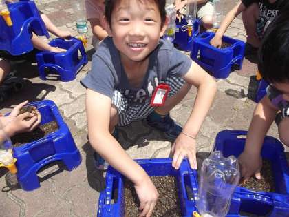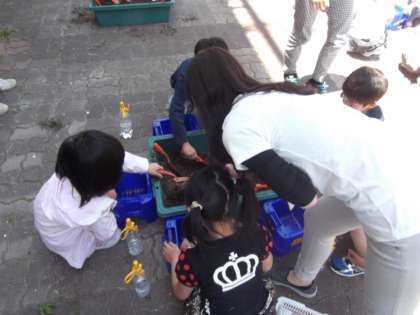 生活科の時間に「おおきくなあれわたしのはな」を学習しています。今日は,あさがおを植える準備をしていました。
