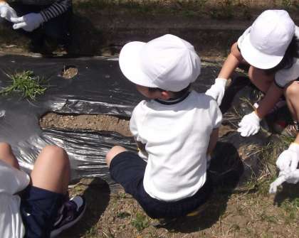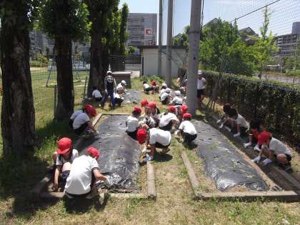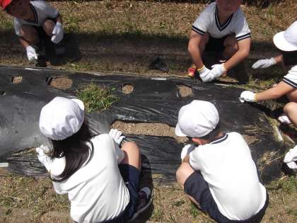 2年生は,なると金時の苗を植える準備で畑の雑草を抜いていました。