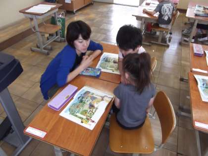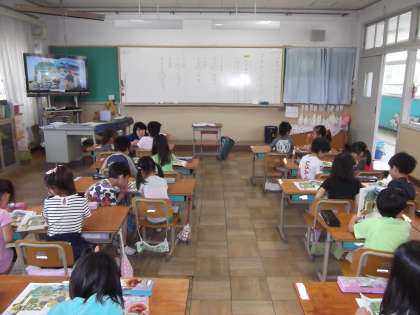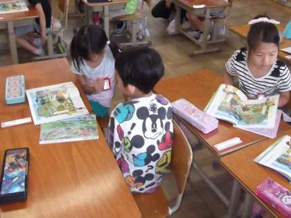 国語の時間に「えをみてはなそう」を学習しています。教科書に出でくる絵を見て絵にあった文を考えていました。