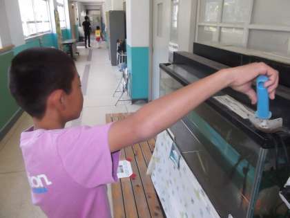 朝休みの時間に飼育委員会の子どもが魚の餌やりをしていました。魚も美味しそうに餌を食べていました。