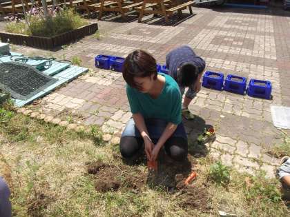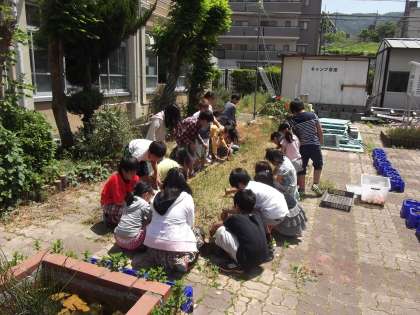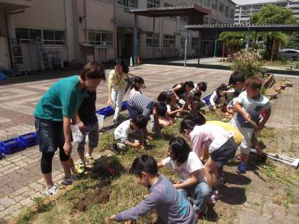 理科の時間に「ひまわり」「ほうせんか」の生長を観察するために苗を植える準備として花壇の草抜きをしていました。