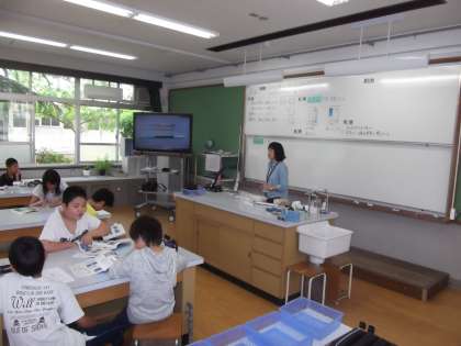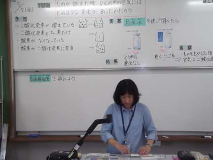 理科の時間に「ものの燃え方」を学習しています。今日は,ものが燃えた後びんの中の空気には,どのような変化があるのかを考える実験をしていました。