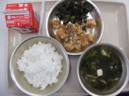 今日の給食の献立は,「ご飯」「豆腐のよしの汁」「たらのこはくあげ」「こまつなとひじきのいためもの」「牛乳」です。