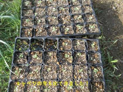 昨日の雨で,キャベツの芽がすべて顔を出しました。5/4にお知らせした時は,まだ半分程度でしたが,今朝はポットすべてに芽が出てきました。もう少しポットで育てて,本葉がでたら畑に植え付ける予定です。