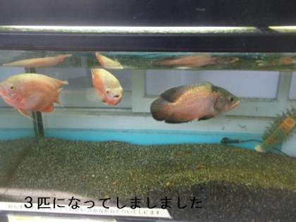 連休中は,とても元気だった「レッドオスカー」が死んでしまいました。突然のことでびっくりしています。連休中に水かえをしたのが原因でしょうか?一番元気で大きかった「レッドオスカー」でしたが残念です。残り元気なオスカーは「アルビノオスカー」2匹「レッドオスカー」1匹になってしまいました。