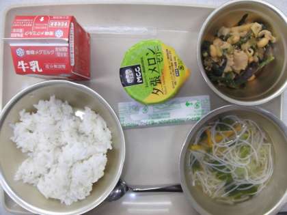 今日の給食の献立は,「麦ごはん」「ビーフンスープ」「肉みそいため」「牛乳」「メロンゼリー」です。