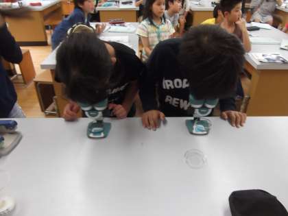 メダカの卵が生まれました。顕微鏡で観察(生れたての卵と生れてから,しばらく経った卵)しています。子ども達は,とても感動していました。