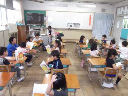 1年2組では,国語の時間に「あさのおひさま」を学習しています。先生の手拍子に合わせて元気に声を出して読んでいました。