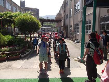 4年生は,小関越えに出発しました。今日の行程と安全確認をして出発しました。