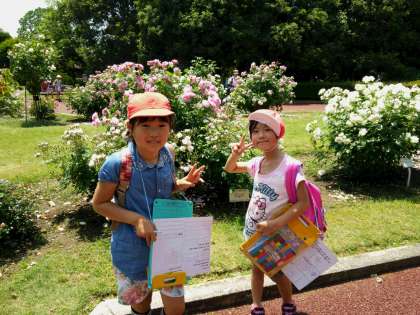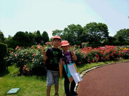 満開のバラ園でバラの観察をしています。