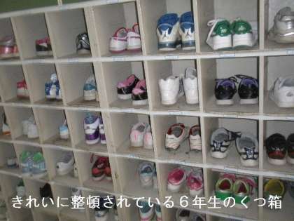 6年生の靴箱には,靴が整然と並んでいます。見ていて気持ちがいいです。一人一人が心がけてもいるのですが,掃除の時間にみんなの靴をそろえてくれている人がいるのです。人への思いやりの心はすばらしいですね。憲法月間の微笑ましい姿です。