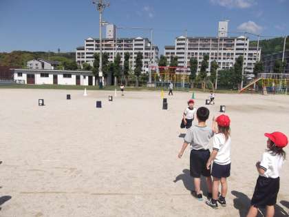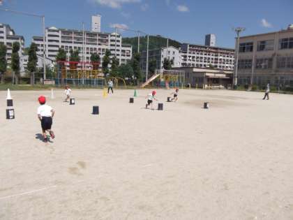 体育の時間に「リレー」の学習をしています。今日は,いろいろな「リレー」をしていました。