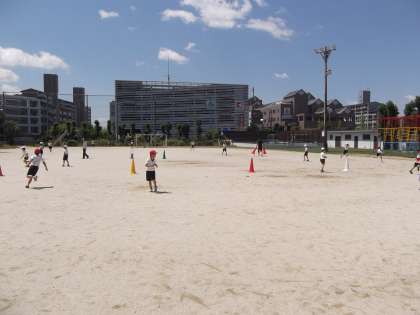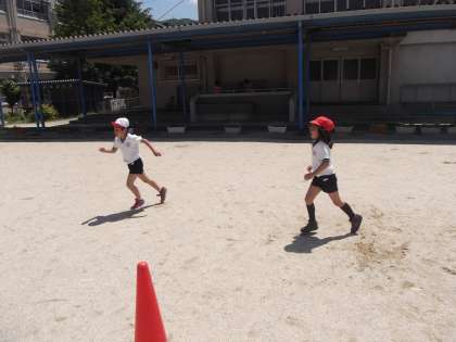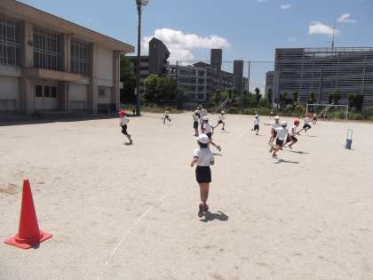 体育の時間に「リレー」の学習をしています。写真の様子は,「リレー」の学習に入る前に準備運動として「おにごっこ」をしていました。