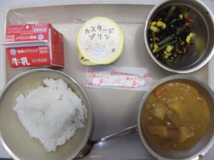 今日の給食の献立は,「ごはん」「カレー」「ひじきのソティ—」「牛乳」です。