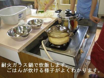 子どもたちは野外炊事の経験は,5年生の時の「長期宿泊・自然体験学習」で何度も何度も経験していますので,包丁さばきは慣れたものですが,耐熱ガラス鍋を使って,ごはんが炊ける様子を見るのは初めてでした。