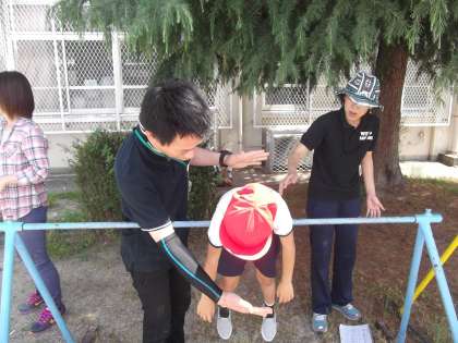 体育の時間に「鉄棒」を学習しています。今日は,鉄棒のぶら下がり方を練習しました。