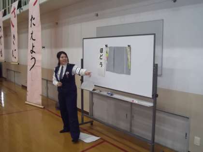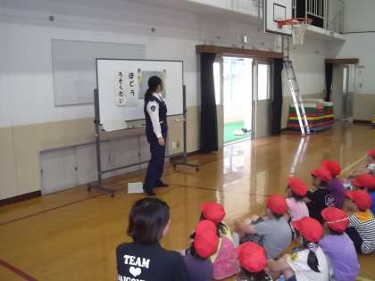 今日は,山科警察署の方に来ていただいて横断歩道のわたり方について教えていただきました。写真は,体育館で横断歩道や信号などについていろいろと教えてもらっています。