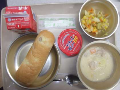 今日の給食の献立は,「おさつパン」「手亡豆のクリームシチュー」「野菜のソティ—」「りんごゼリー」「牛乳」です。