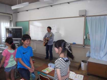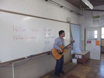 外国語の時間にギターの演奏に合わせて「ハローソング」を楽しそうに歌っていました。