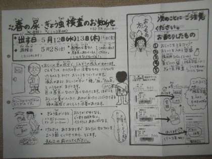 明日12日(水)は「検尿(全学年)・ぎょう虫検査(1〜3年)」があります。