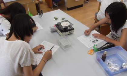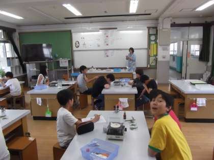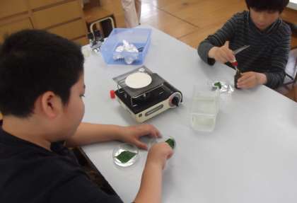 理科の時間に「植物の成長と日光の関わり」を学習しています。今日は,葉にでんぷんが含まれているかどうかを確かめる実験をしていました。
