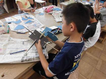 5年生は,図工の授業では,電動糸のこぎりを使って立体をつくっています。糸のこぎりで切った板の組み合わせ方を工夫して,発想豊かな作品をつくっていました。