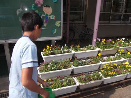 朝休みの時間に環境委員会のお友だちが校内の植物のお世話をしていました。