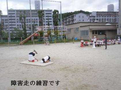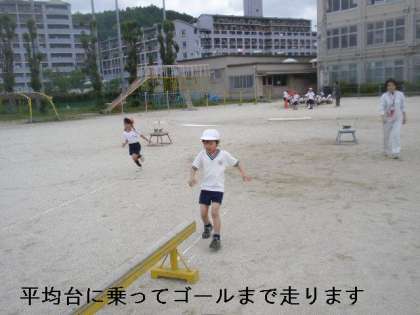 今日は,障害走の練習をしました。よーいドンでスタート,最初はマットで前回り,次にゴム紐の下をくぐりぬけて,平均台を渡ります。そして,最後に紅白玉を拾って箱の中へ入れてゴールします。