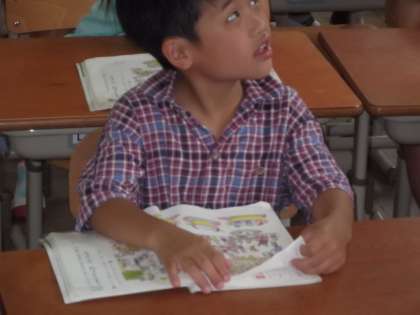 国語の時間に「ともこさんはどこかな」を学習しています。今日は,お知らせを聞いてともこさんがどこにいるか探していました。