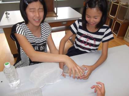 理科の時間に「植物の成長と日光の関わり」を学習しています。今日は,でんぷんを取り出す実験をしてます。集中して実験をしていました。