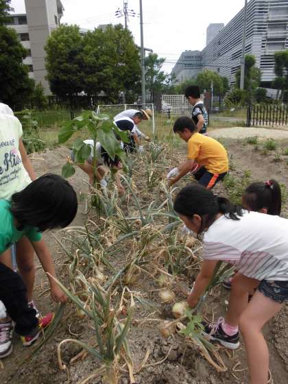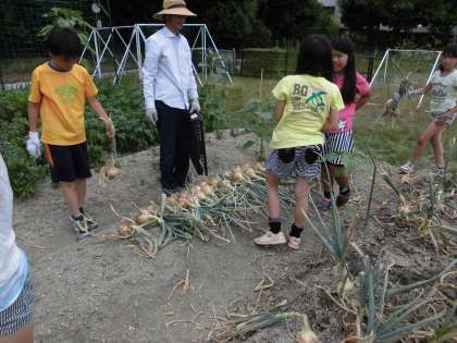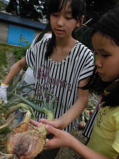 「双子のたまねぎだ!」の声にみんな「どれ?」「見せて!」興味しんしんです。