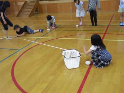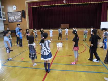 3年生は,3時間目に体育館で「玉入れゲーム」をしました。しかし,はじめてすぐに子どもたちから「ずるーい」「かごに近い人と遠い人がいる」という意見。どこにたてば,不公平のない玉入れゲームになるのかを考えていくと,かご(中心)からみんな同じ距離の位置に立てば公平になることに気付いていきました。子ども達が立った位置を結ぶと円の形に!!楽しい玉入れは実は算数の円の学習だったのです。