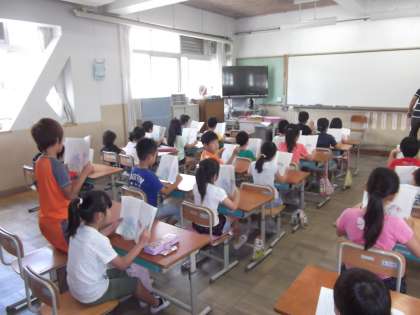 国語の時間に「スイミー」を学習しています。写真は,みんなで「まる読み」をしていました。上手に「まる読み」をすることが出来ました。