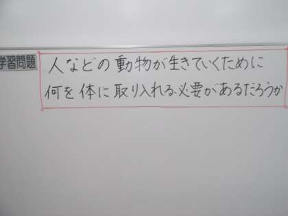 理科の時間に「体のつくりとはたらき」を学習しています。今日は,人や動物が生きていくために何をからだに取り入れたらよいのかを考えていました。