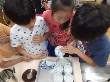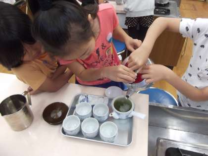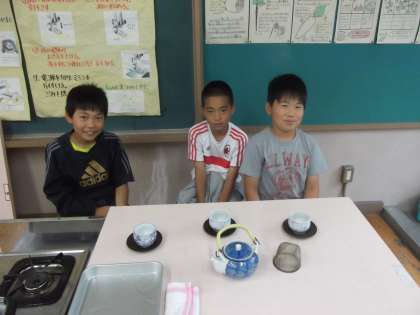 家庭科の時間に「おいしい料理」を学習しています。今日は,お茶の入れ方等を学習していました。