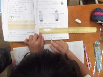 算数の時間に「長さ」を学習しています。今日は,ものさしを使っていろいろな長さの線を図る練習をしていました。
