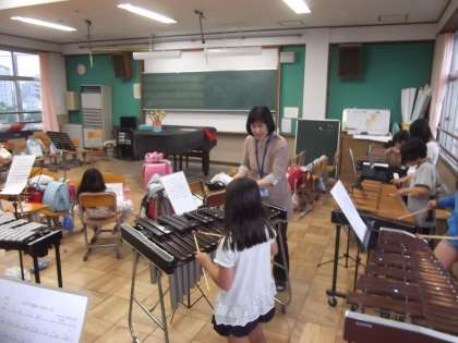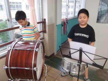 雨のためソフトボール部は,体育館で室内練習をしていました。音楽部は,「ゲバゲバ90分」の合奏の練習をしていました。