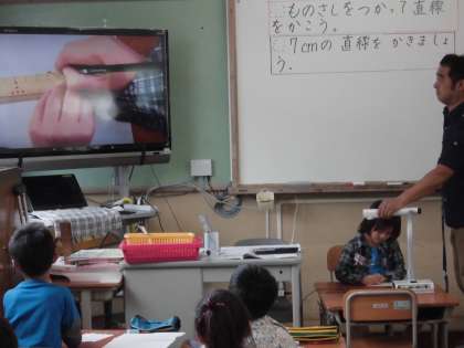 算数の時間に「長さ」の学習をしています。今日は,ものさしを使って直線を書く練習をしていました。