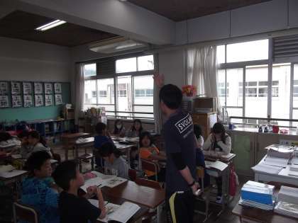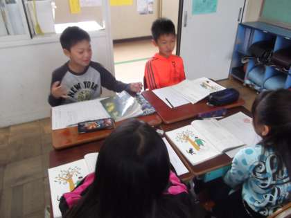 国語の時間に「生き物は円柱形」を学習しています。今日は,3段落の内容をグループで話し合っていました。