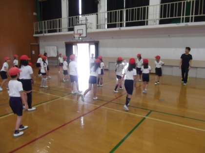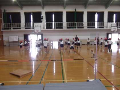 体育の時間に「高とび」を学習しています。写真は,学習前の準備体操の様子です。